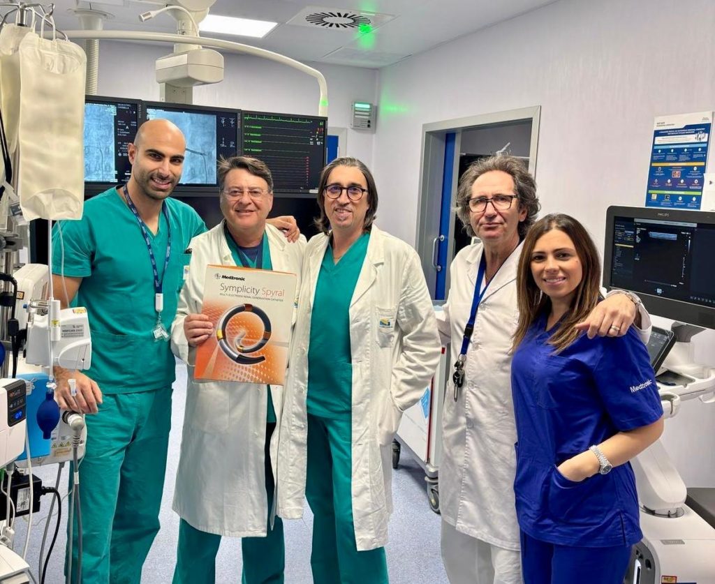 L’Uosd di Emodinamica dell’Ospedale di Taormina ha recentemente effettuato con successo interventi di denervazione renale, una tecnica innovativa per il trattamento dell’ipertensione arteriosa refrattaria, ovvero quella forma di ipertensione che non risponde adeguatamente alla terapia farmacologica convenzionale. L’intervento di denervazione renale si configura come una soluzione efficace per i pazienti selezionati, contribuendo a un migliore controllo della pressione arteriosa e, di conseguenza, a una riduzione del rischio cardiovascolare a lungo termine. L’intervento mira a bloccare la comunicazione degli impulsi nervosi diretti ai reni e viceversa, disattivando le fibre nervose renali del sistema simpatico. La procedura, che viene effettuata in sedazione profonda e dura all’incirca un’ora, prevede l’impiego di un dispositivo medico che fornisce energia a radiofrequenza a bassa intensità. Dunque, quando le modifiche nelle abitudini alimentari e i trattamenti farmacologici non producono i risultati desiderati, si può passare alla denervazione delle fibre nervose. Il dott. Giuseppe Cinnirella responsabile della Uosd di Emodinamica di Taormina e la sua equipe composta dai medici Paolo D’Arrigo, Gessica Motta, Gianfranco Capilli e Graziano Trovato, ringraziano la Direzione Strategica dell’Asp di Messina, il cui supporto costante verso l’innovazione ha reso possibile l’implementazione di tecniche all’avanguardia, migliorando il percorso di cura per i pazienti affetti da ipertensione resistente. Ulteriori ringraziamenti anche al primario di Anestesia e Rianimazione, dott. Giacomo Filoni, per l’eccellente assistenza anestesiologica fornita durante le procedure.